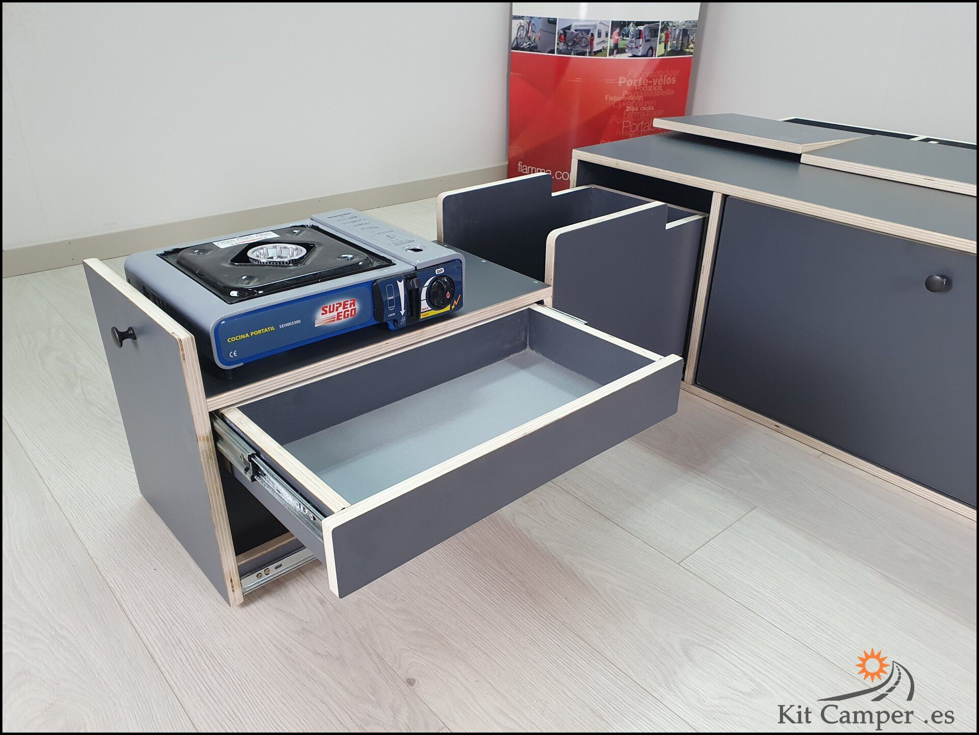 Dispone de 2 Cajones , 1en 2 alturas para cocina + Cajón para cubiertos , 1 Cajón Grande y tapas de arcón traseras
