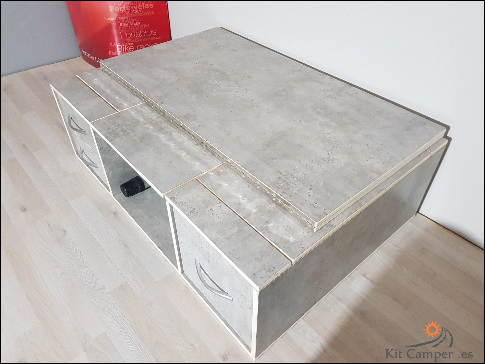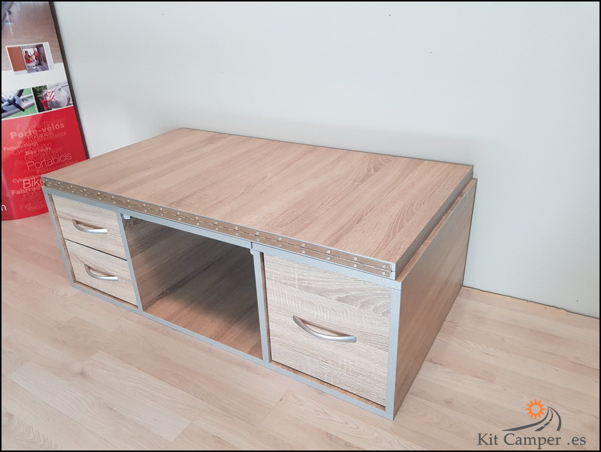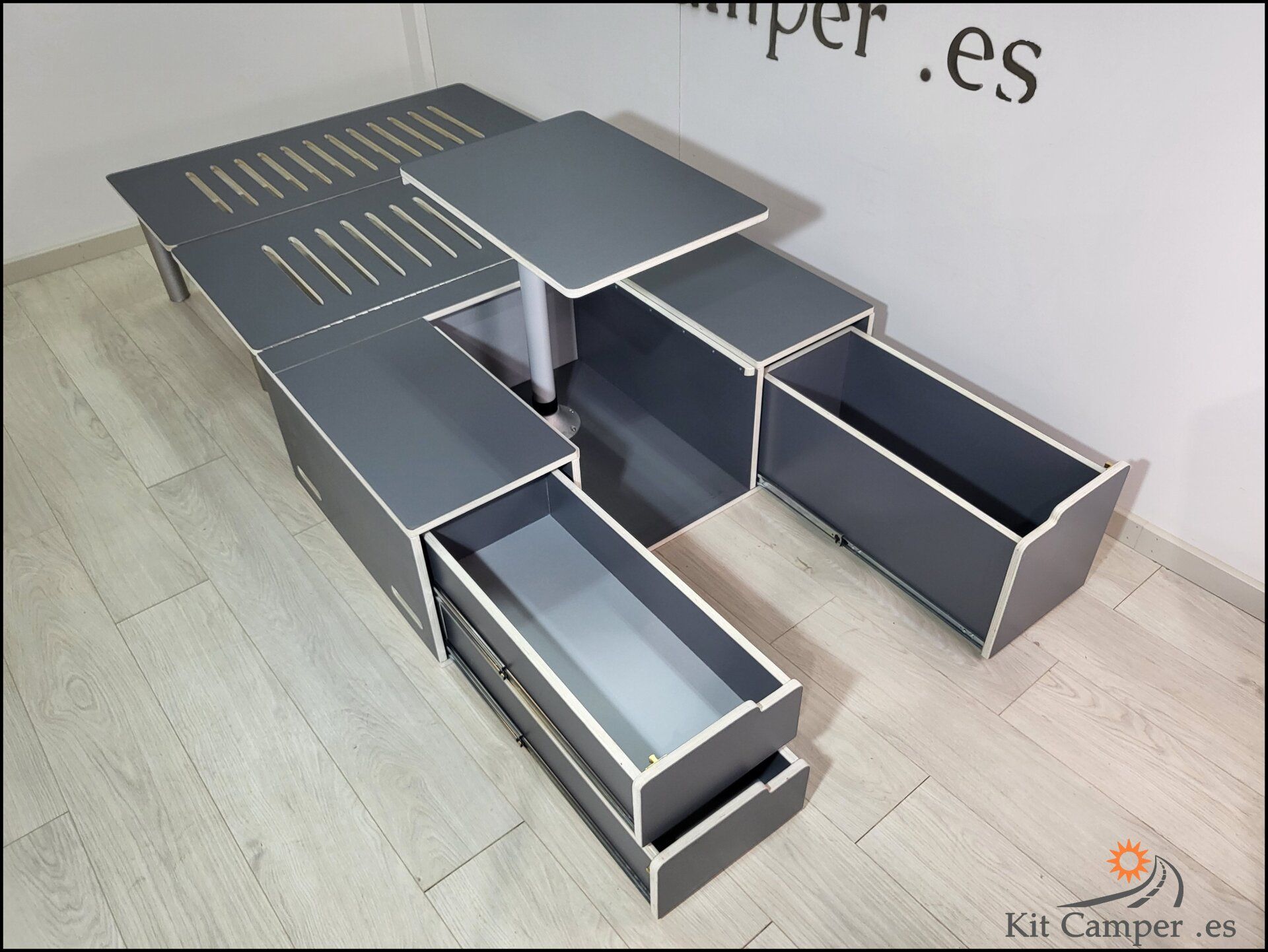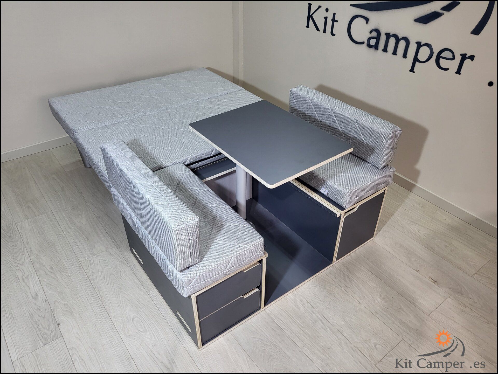 Este Modelo de Mueble se Fabrica a la Medida de Cada Furgoneta.Equipamiento: - 2 Cajones pequeños en lado derecho - 1 Cajon grande en lado Izquierdo - Mesa Central - Extensibles para Cama con patas de apoyo - Incluido guías Metálicos