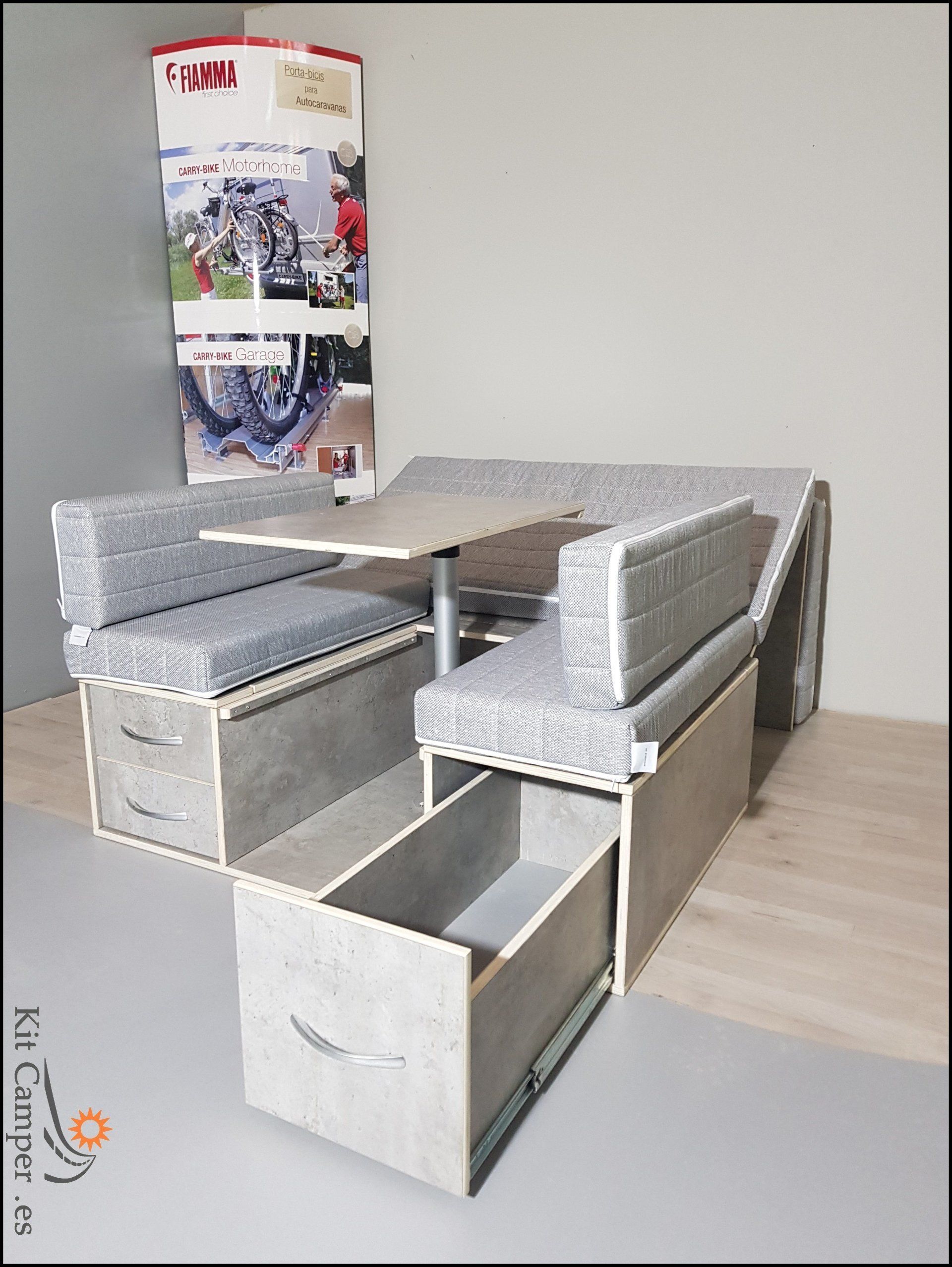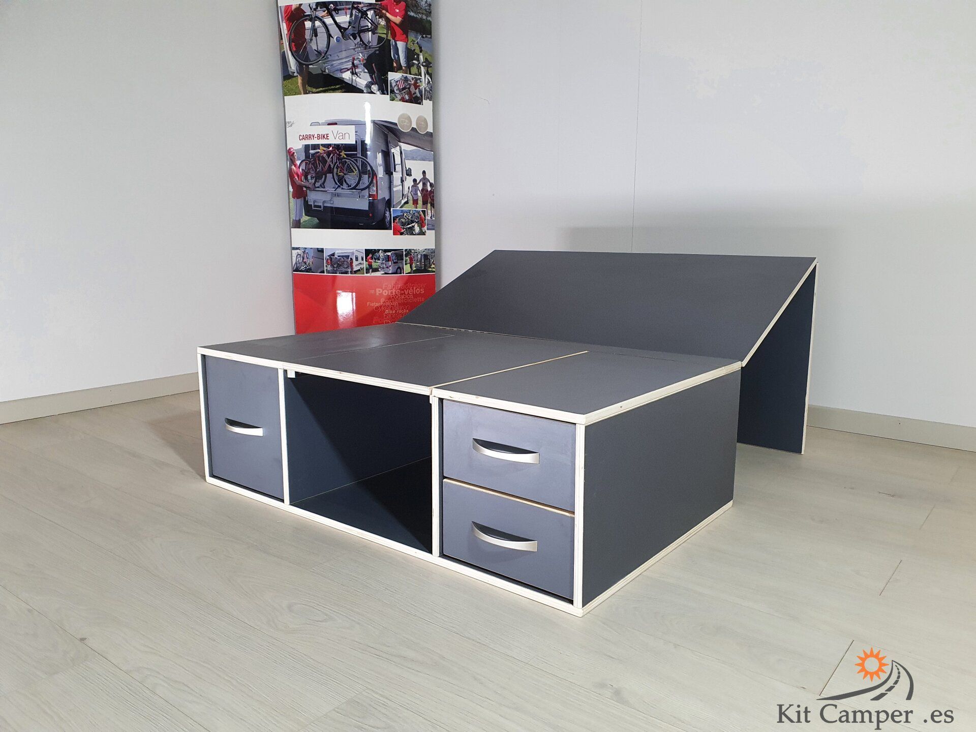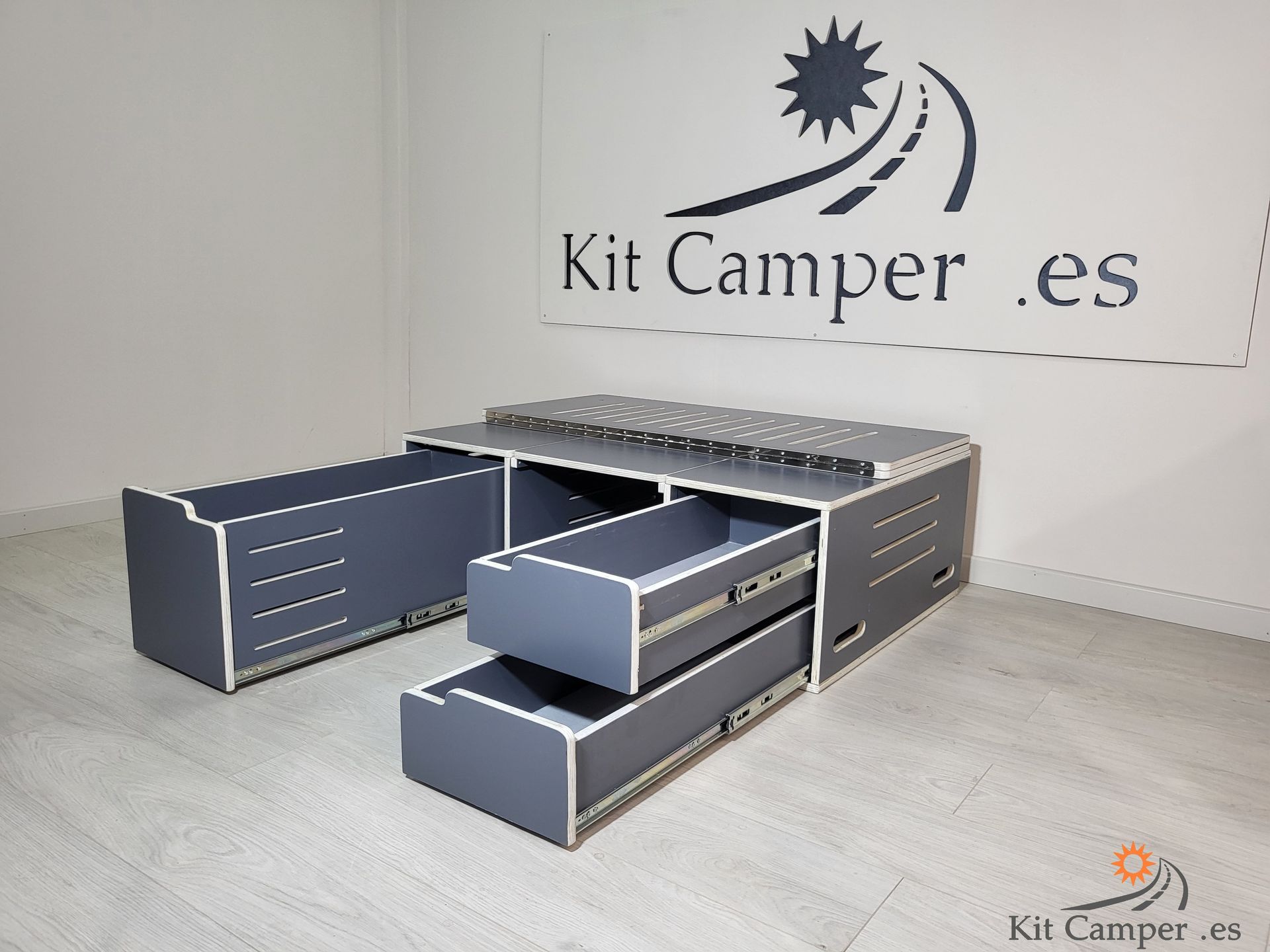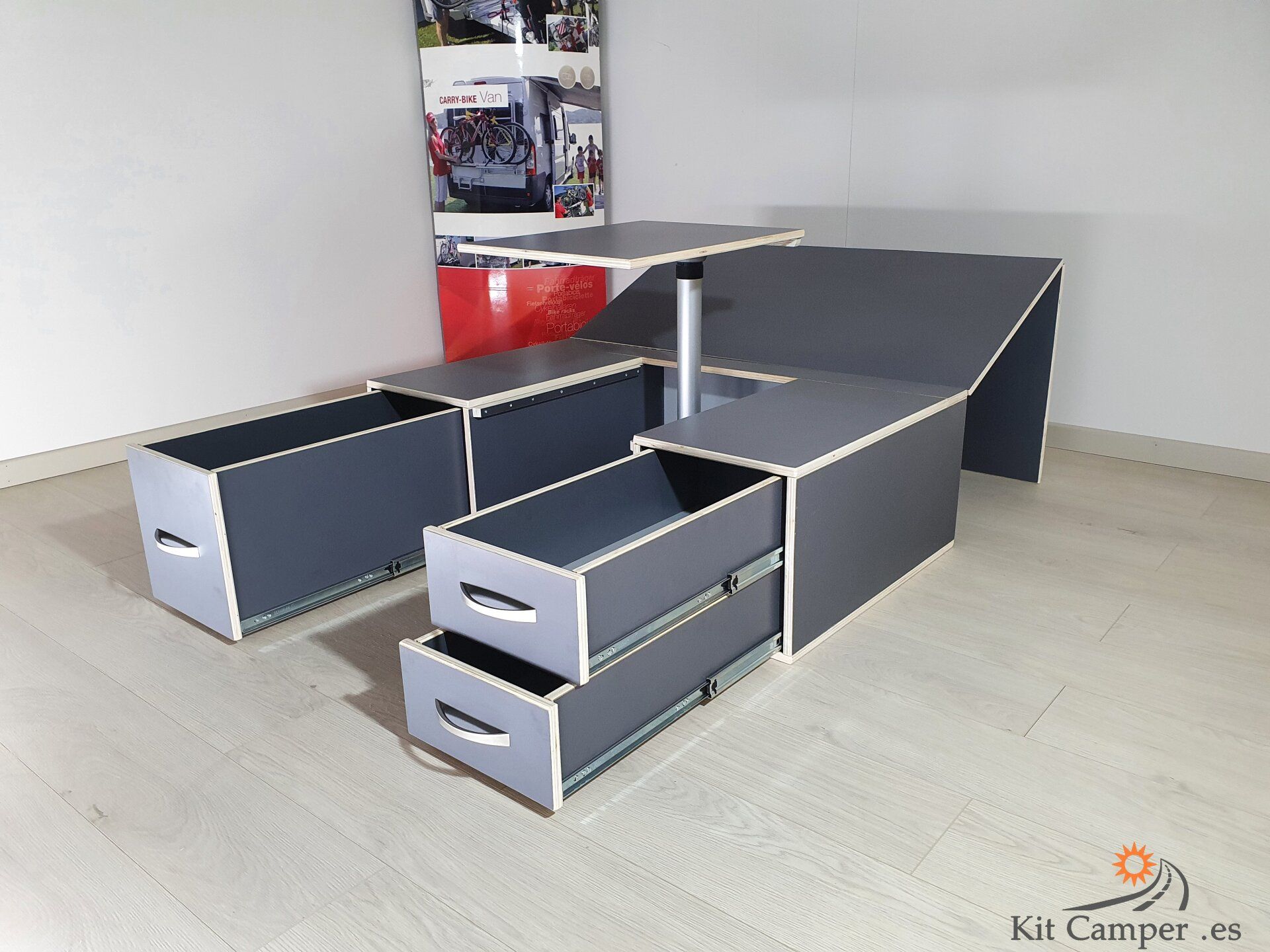 Este Modelo de Mueble se Fabrica a la Medida de Cada Furgoneta.Equipamiento: - 2 Cajones pequeños en lado derecho - 1 Cajon grande en lado Izquierdo - Mesa Central - Extensibles para Cama con patas de apoyo - Incluido guías Metálicos