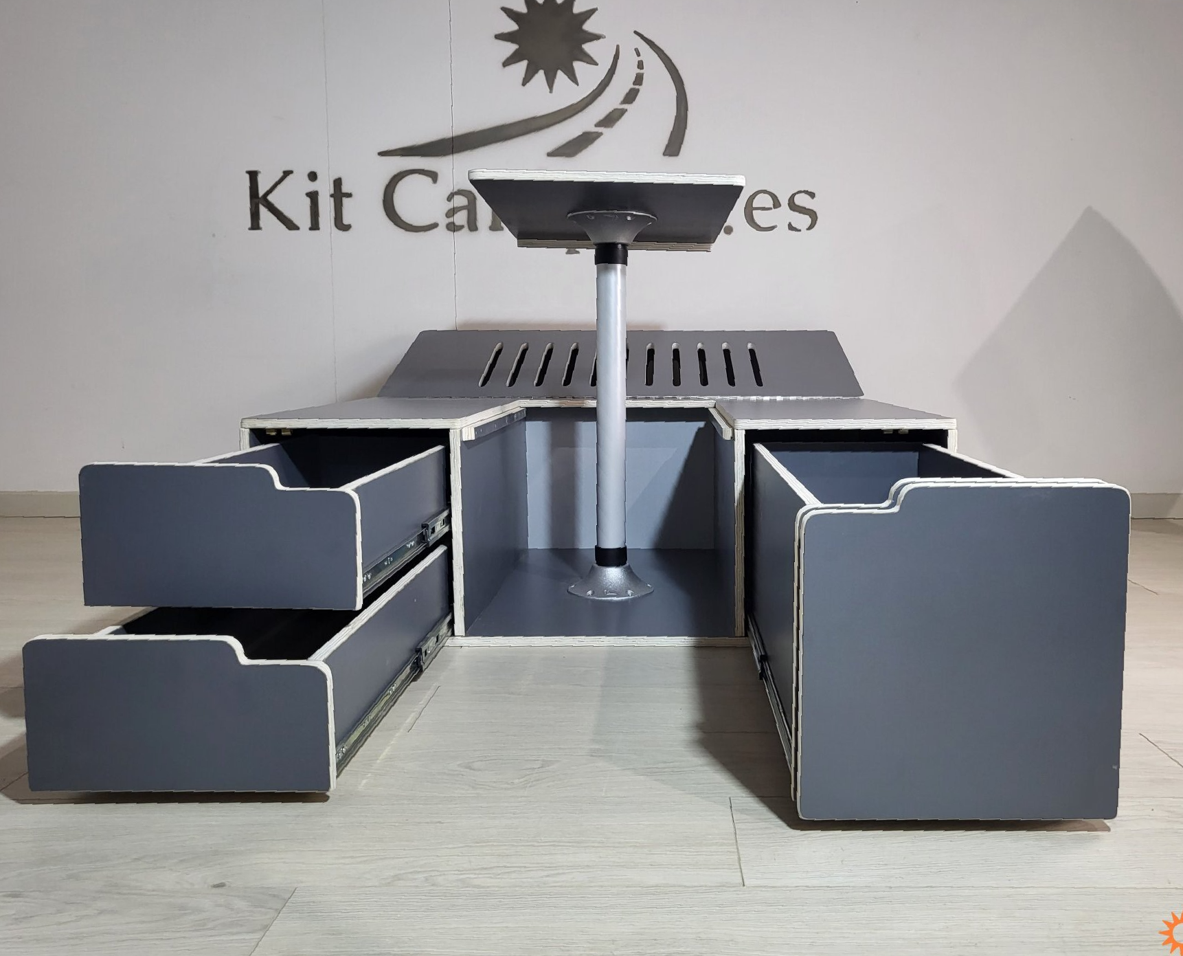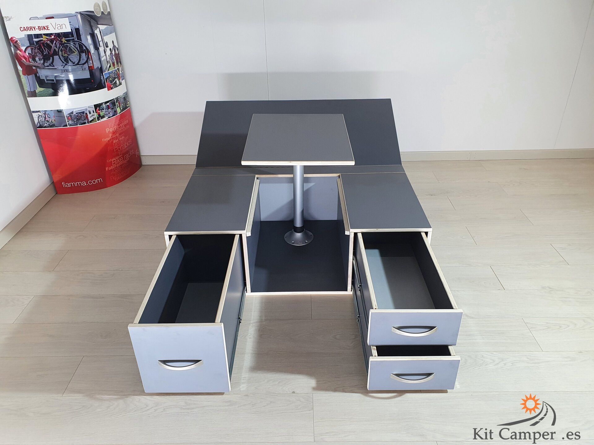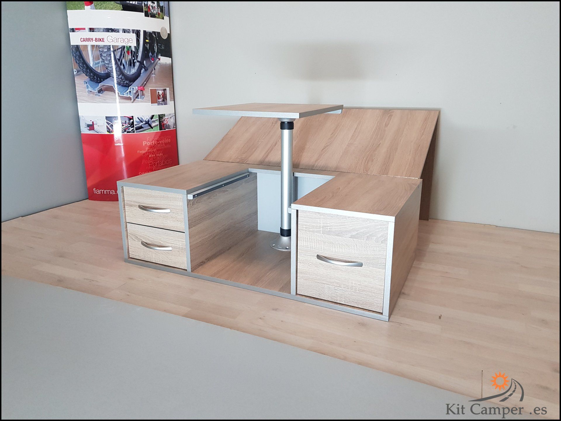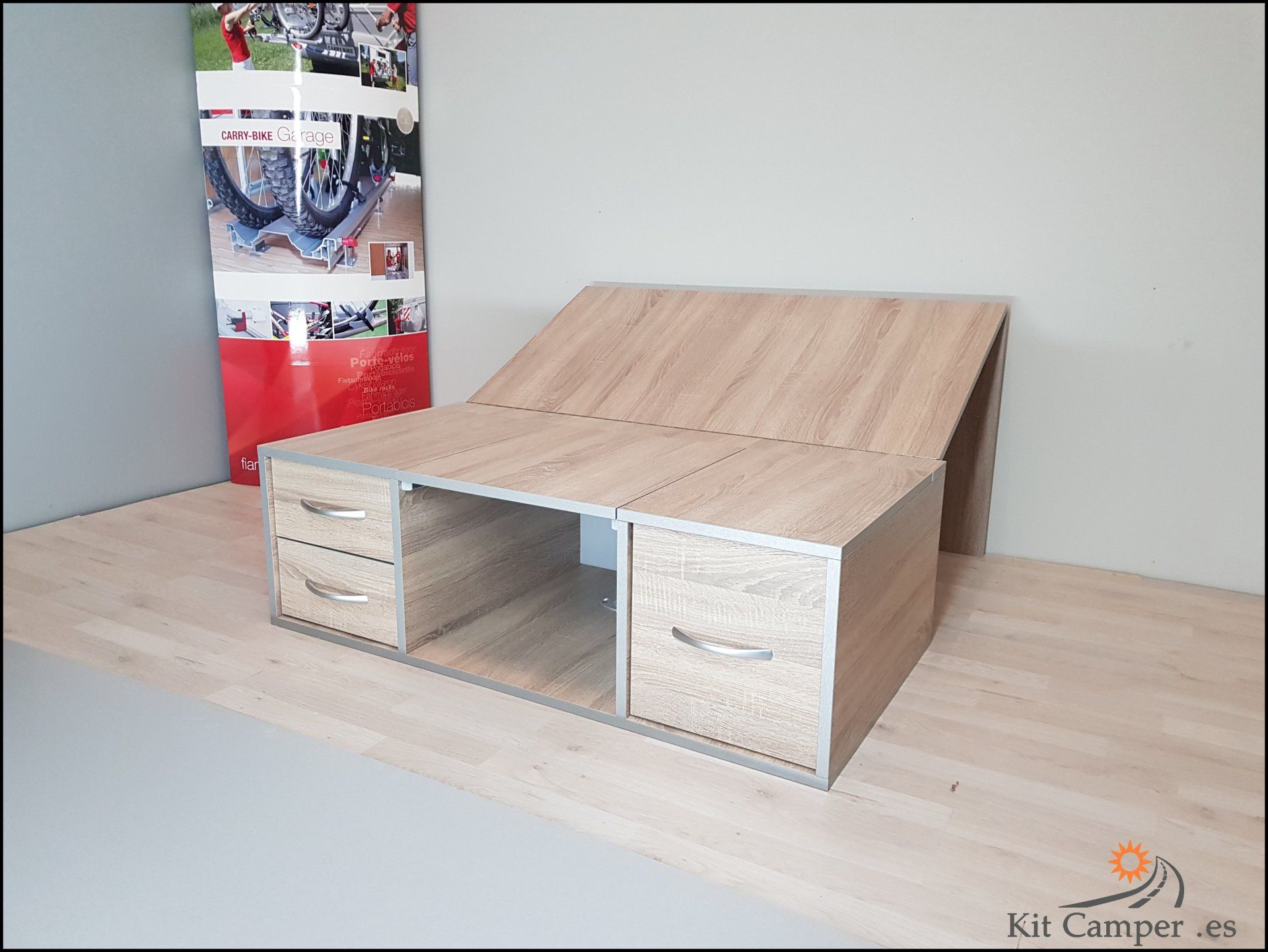 Este Modelo de Mueble se Fabrica a la Medida de Cada Furgoneta.Equipamiento: - 2 Cajones pequeños en lado derecho - 1 Cajon grande en lado Izquierdo - Mesa Central - Extensibles para Cama con patas de apoyo - Incluido guías Metálicos