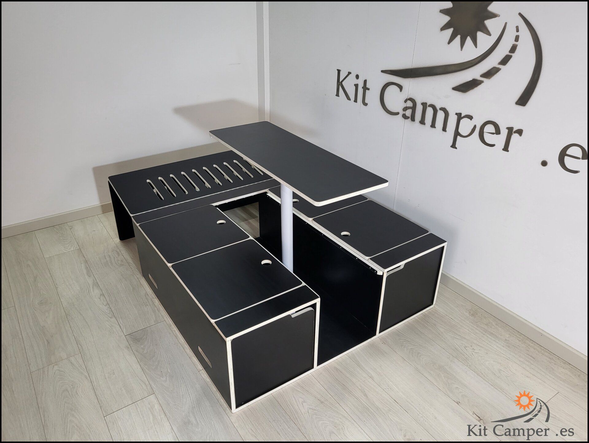 Equipamiento: - 1 Cajón adaptado para cocina y nevera en lado izquierdo - 1 cajón normal en lado derecho - 4 Tapas de arcón en parte superior - Mesa central de 90x40- Extensibles para cama con patas de apoyo